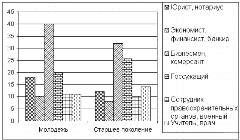 ?) по мнению как юношей, так и девушек, ведущую роль играют в обществе нормы морали ?) девушки, в большей степени, чем юноши, считают правовые нормы значимыми в жизни общества ?) юноши в качестве ведущего типа социальных норм указывают право ?) для девушек мораль и красота равно значимы в жизни общества Вопрос id:416828 Тема/шкала: B10-Социальные отношения-Задание на обращение к социальным реалиям. Анализ диаграмм В стране А. социологические службы проводили опрос среди граждан двух возрастных групп: молодежи (20–30 лет) и старшего поколения (40-55 лет). Респондентам (гражданам, участвующим в опросе) был задан вопрос: «Какие профессии Вам представляются наиболее престижными?» Результаты опроса (в %) представлены на диаграмме: Какие выводы можно сделать на основании данной графической информации?