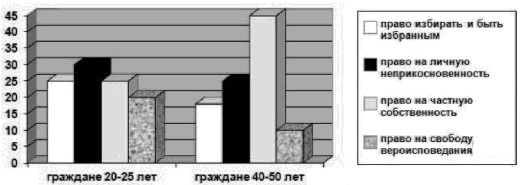 ?) Наиболее качественной и достоверной представляется гражданам информация, которая распространяется печатными СМИ. ?) Самый высокий процент граждан, опрошенных в 2012 г., считает наиболее достоверной информацию электронных СМИ. ?) Информация телевизионных передач признаётся гражданами, опрошенными в 2012 году, более достоверной, чем информация электронных СМИ. ?) Участвующие в опросе граждане считают радионовости более популярными и достоверными, чем телевизионные новости. Вопрос id:416835 Тема/шкала: B10-Социальные отношения-Задание на обращение к социальным реалиям. Анализ диаграмм Социологические службы страны Д. провели среди граждан двух возрастных групп (20-25 лет и 40-50 лет) опрос для выяснения их отношения к основным правам, зареплённым в Конституции страны. Респондентам был задан вопрос: «Какие права Вы считаете наиболее значимыми для Вас»? Результаты опроса (в %) представлены в диаграмме.
