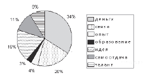 ?) Женщины в основном предпочитают знать только свой родной язык. ?) Среди утверждающих, что владение иностранными языками необходимо, мужчин больше, чем женщин. ?) Подавляющее большинство опрошенных мужчин и женщин считают необходимым владение иностранными языками. ?) Большинство опрошенных ставит изучение иностранных языков в зависимость от рода деятельности. Вопрос id:416845 Тема/шкала: B10-Социальные отношения-Задание на обращение к социальным реалиям. Анализ диаграмм В стране Z в 2011 году проводился социологический опрос. Респондентам задавали вопрос: «Что является самым нужным для успешного начала бизнеса?». Полученные результаты представлены в диаграмме.