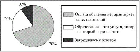 ?) Пятая доля опрошенных относятся к образованию как к услуге. ?) Большинство отвечавших испытали затруднение при ответе на вопрос. ?) Среди респондентов преобладают те, кто считает, что плата за образование гарантирует его качество. ?) Доля сторонников платного образования превышает долю тех, кто не считает оплату обучения гарантией его качества. Вопрос id:416848 Тема/шкала: B10-Социальные отношения-Задание на обращение к социальным реалиям. Анализ диаграмм