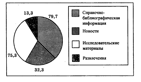 ?) Среди интересов ученых-обществоведов сайты, связанные с развлечениями, находятся на третьем месте. ?) Наибольший интерес у ученых-обществоведов вызывает справочно-библиографическая информация. ?) Наименьший интерес у ученых-обществоведов вызывает новостная информация. ?) Максимальное количество обращений связано с исследовательскими сайтами. Вопрос id:416849 Тема/шкала: B10-Социальные отношения-Задание на обращение к социальным реалиям. Анализ диаграмм