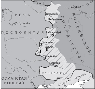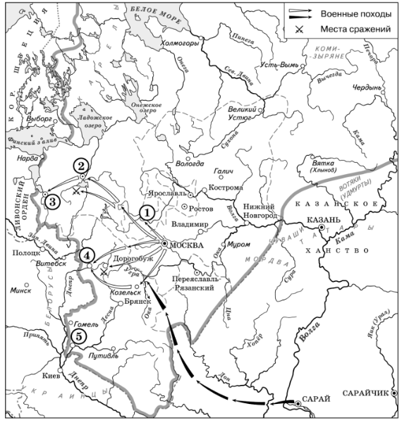 Укажите век, когда в состав единого Русского государства вошли города, обозначенные на схеме цифрами «3», «4» и «5» (ответ напишите словом). Вопрос id:433230 Тема/шкала: B30-Анализ исторических карт, схем-VIII - XVII века Рассмотрите схему и выполните задания