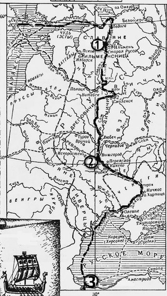 Напиши имя князя, который установил контроль над этим торговым путем. Вопрос id:433223 Тема/шкала: B30-Анализ исторических карт, схем-VIII - XVII века Рассмотрите схему и выполните задание