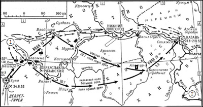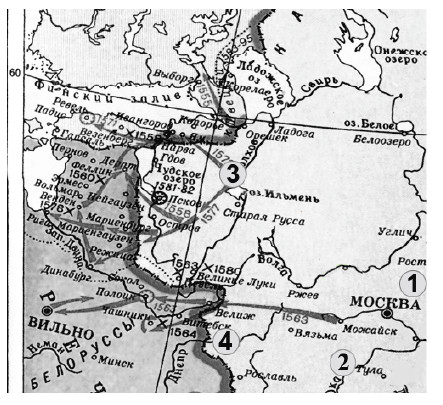 Напишите название реки, обозначенной на схеме цифрой «1»? Вопрос id:433221 Тема/шкала: B30-Анализ исторических карт, схем-VIII - XVII века Напишите название города, в который был совершён карательный поход правительственных войск, сопровождавшийся массовыми убийствами.