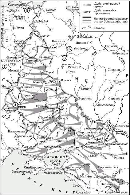 Напишите фамилию генерала, который руководил боевыми действиями на юге против Советской России. Вопрос id:433261 Тема/шкала: B30-Анализ исторических карт, схем-XX век Рассмотрите схему и выполните задания