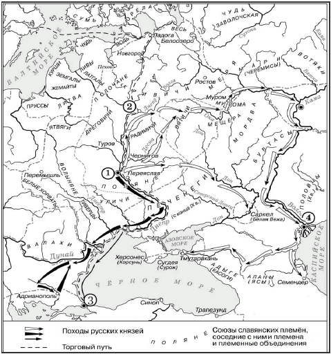 Назовите князя, совершившего походы, обозначенные на схеме стрелками. Вопрос id:433232 Тема/шкала: B30-Анализ исторических карт, схем-VIII - XVII века Рассмотрите схему и выполните задание