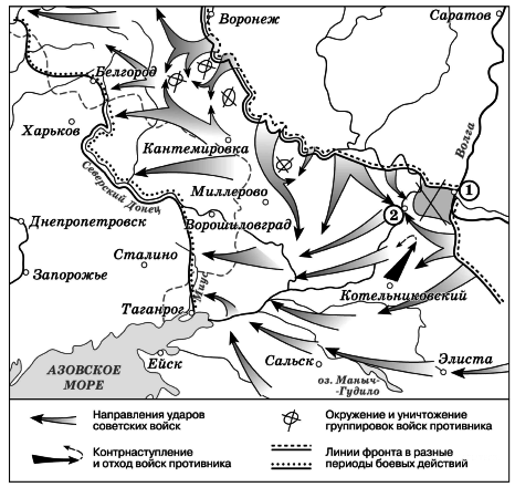 Укажите название города, обозначенного на схеме цифрой «2», в районе которого произошло соединение войск двух фронтов Красной армии. Вопрос id:433268 Тема/шкала: B30-Анализ исторических карт, схем-XX век Рассмотрите схему событий одного из периодов Великой Отечественной войны и выполните задание.