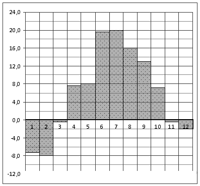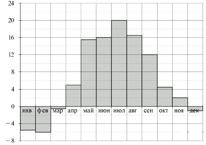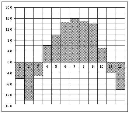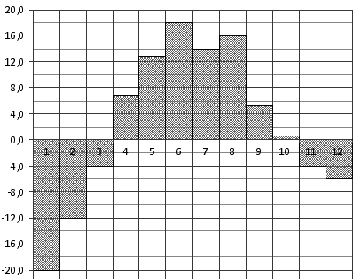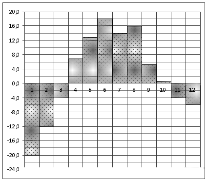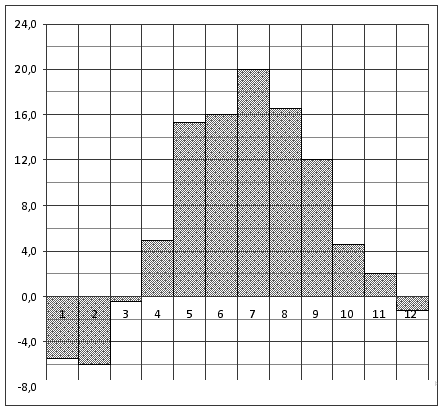 Вопрос id:434139 Тема/шкала: 02-Чтение графиков и диаграмм-Определение величины по диаграмме На диаграмме показана среднемесячная температура воздуха в Нижнем Новгороде (Горьком) за каждый месяц 1994 года. По горизонтали указываются месяцы, по вертикали — температура в градусах Цельсия. Определите по диаграмме, сколько было месяцев с положительной среднемесячной температурой.