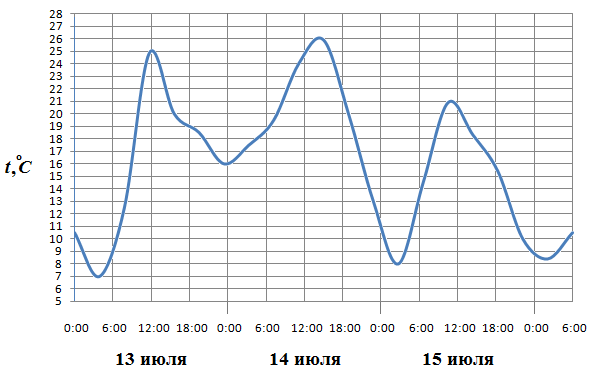 Вопрос id:434153 Тема/шкала: 02-Чтение графиков и диаграмм-Определение величины по графику На графике изображена зависимость крутящего момента двигателя от числа его оборотов в минуту. На оси абсцисс откладывается число оборотов в минуту, на оси ординат — крутящий момент в Н м. Скорость автомобиля (в км/ч) приближенно выражается формулой v = 0,036n, где n — число оборотов двигателя в минуту. С какой наименьшей скоростью должен двигаться автомобиль, чтобы крутящий момент был не меньше 120 Н м? Ответ дайте в километрах в час.Вопрос id:434154 Тема/шкала: 02-Чтение графиков и диаграмм-Определение величины по графику На рисунке показано изменение температуры воздуха на протяжении трех суток. По горизонтали указывается дата и время суток, по вертикали — значение температуры в градусах Цельсия. Определите по рисунку разность между наибольшей и наименьшей температурой воздуха 15 июля. Ответ дайте в градусах Цельсия.