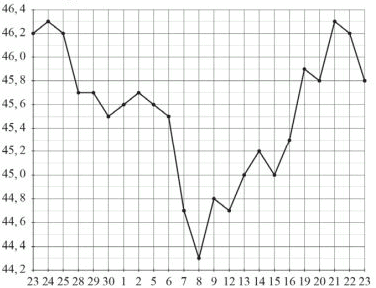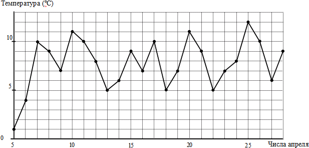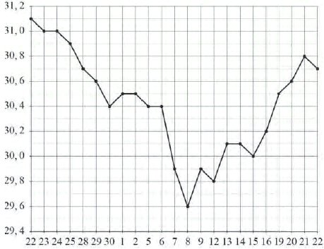 ![]() Вопрос id:434133 Тема/шкала: 02-Чтение графиков и диаграмм-Определение величины по графику На рисунке жирными точками показан курс китайского юаня, установленный Центробанком РФ, во все рабочие дни с 23 сентября по 23 октября 2010 года. По горизонтали указываются числа месяца, по вертикали — цена китайского юаня в рублях. Для наглядности жирные точки на рисунке соединены линией. Определите по рисунку наименьший курс китайского юаня за указанный период. Ответ дайте в рублях. ![]() Вопрос id:434134 Тема/шкала: 02-Чтение графиков и диаграмм-Определение величины по графику На рисунке жирными точками показана среднесуточная температура воздуха в Сочи каждый день с 5 по 28 апреля 1998 года. На оси абсцисс отмечены дни, на оси ординат — температура в градусах Цельсия. Для наглядности жирные точки соединены линией. Определите по рисунку наибольшую среднесуточную температуру воздуха в Сочи в период с 7 по 24 апреля.