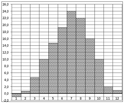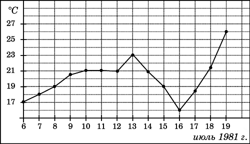 Вопрос id:434155 Тема/шкала: 02-Чтение графиков и диаграмм-Определение величины по графику На рисунке жирными точками показана среднесуточная температура воздуха в Бресте каждый день с 6 по 19 июля 1981 года. По горизонтали указываются числа месяца, по вертикали — температура в градусах Цельсия. Для наглядности жирные точки соединены линией. Определите по рисунку разность между наибольшей и наименьшей среднесуточными температурами за указанный период. Ответ дайте в градусах Цельсия. ![]() Вопрос id:434156 Тема/шкала: 02-Чтение графиков и диаграмм-Определение величины по диаграмме На диаграмме показана среднемесячная температура воздуха в Екатеринбурге (Свердловске) за каждый месяц 1973 года. По горизонтали указываются месяцы, по вертикали — температура в градусах Цельсия. Определите по диаграмме разность между наибольшей и наименьшей среднемесячными температурами в 1973 году. Ответ дайте в градусах Цельсия.