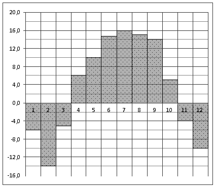 Вопрос id:434135 Тема/шкала: 02-Чтение графиков и диаграмм-Определение величины по диаграмме На диаграмме показана среднемесячная температура в Нижнем Новгороде (Горьком) за каждый месяц 1994 года. По горизонтали указываются месяцы, по вертикали — температура в градусах Цельсия. Определите по диаграмме наименьшую среднемесячную температуру в 1994 году. Ответ дайте в градусах Цельсия.