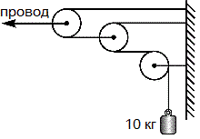 На железной дороге для натяжения проводов используется показанная на рисунке система, состоящая из легких блоков и тросов, натягиваемых тяжелым грузом. Чему равна сила натяжения провода? Трение в осях блоков мало. Блоки и нити считайте невесомыми.