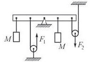 ?) 400 Н ?) 200 Н ?) 800 Н ?) 100 Н Вопрос id:436472 Тема/шкала: B5-Статика, механические колебания и волны-Статика Чтобы уравновесить на лёгкой рейке с помощью двух невесомых блоков одинаковые грузы массой М каждый, к нити, перекинутой через левый блок, и к оси правого блока необходимо приложить вертикальные силы F1 и F2 (см. рисунок). Расстояния между чёрными точками на рейке одинаковы, трение отсутствует, нити нерастяжимы.