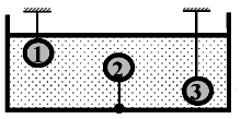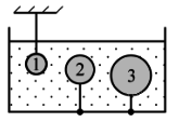 Три шарика одинаковых размеров погружены в воду и удерживаются нитями на разной глубине (см. рисунок). При этом