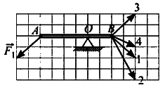 Лёгкая палочка может вращаться на шарнире вокруг горизонтальной оси, проходящей через точку О (см. рисунок). В точке А на палочку действуют силой F1. Для того, чтобы палочка находилась в равновесии, к ней в точке В следует приложить силу, обозначенную на рисунке номером
