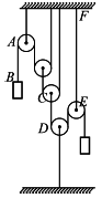 С помощью системы невесомых блоков на невесомых и нерастяжимых нитях уравновешены два груза (см. рисунок). Модуль силы натяжения участка нити AB равен T. Установите соответствие между модулями сил натяжения и участками нитей.