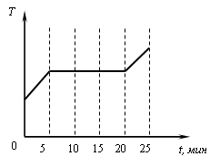 ?) 30 кДж ?) 5 кДж ?) 20 кДж ?) 15 кДж Вопрос id:436831 Тема/шкала: B8-Молекулярно-кинетическая теория-Фазовые переходы, равновесие фаз На рисунке показан график зависимости температуры Т вещества от времени t.