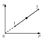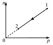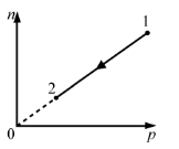 При переводе идеального газа из состояния 1 в состояние 2 концентрация молекул n пропорциональна давлению р (см. рисунок). Масса газа в процессе остаётся постоянной. Утверждается, что в данном процессе А. плотность газа возрастает. Б. происходит изотермическое расширение газа. Из этих утверждений