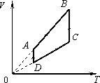 ?) CD ?) DA ?) AB ?) BC Вопрос id:436885 Тема/шкала: B9-Изопроцессы, работа в термодинамике, первый закон термодинамики-Изотермический, изохорический, изобарический, адиабатический процессы, Идеальный газ сначала нагревался при постоянном давлении, потом его давление уменьшалось при постоянном объеме, затем при постоянной температуре объем газа уменьшился до первоначального значения. Какой из графиков на рисунке в координатных осях V—Т соответствует этим изменениям состояния газа?