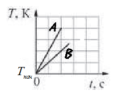 На рисунке изображены графики зависимостей температуры Т от времени t для двух твёрдых тел А и В, нагреваемых в двух одинаковых печах. Какое из следующих утверждений справедливо?