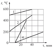 Четыре шарика 1, 2, 3 и 4 одинаковой массы, сделанные из различных материалов, находятся в твёрдом состоянии. Шарики нагревают в одной и той же печи. На рисунке приведены графики зависимостей температуры t шариков от времени τ. Наибольшей удельной теплоёмкостью обладает шарик