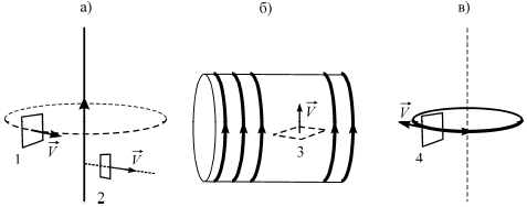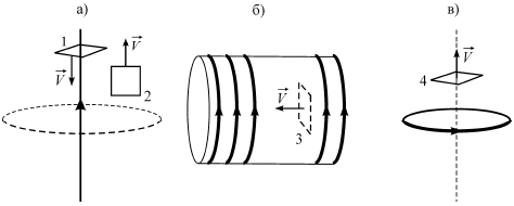?) А — отрицательным; В — положительным ?) А — останется нейтральным; В — отрицательным ?) А — положительным; В — отрицательным ?) А — положительным; В — останется нейтральным Вопрос id:437234 Тема/шкала: B13-Электризация. Электромагнитная индукция. Интерференция, дифракция и дисперсия-Электромагнитная индукция Четыре проволочные рамки перемещают в области магнитного поля, создаваемого: а) прямым проводом с током; б) длинным соленоидом с током; в) тонким кольцом с током. Направления перемещения рамок показаны на рисунках.