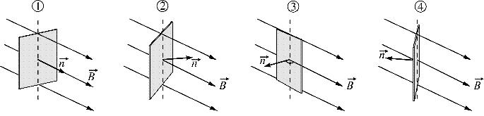 нормали к ее плоскости. На каком из приведенных рисунков магнитный поток, пронизывающий рамку, отрицателен?