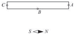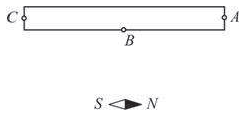 ?) не может быть определён при помощи данного опыта ?) находится в точке А ?) находится в точке С ?) находится в точке В Вопрос id:437264 Тема/шкала: B14-Электричество и магнетизм-Направление магнитного поля Возле полосового магнита, взятого в школьном кабинете физики расположена магнитная стрелка. Из прилагаемой к магниту инструкции следует, что он намагничен вдоль своей длины. Размеры стрелки намного меньше размеров магнита. Стрелка в состоянии равновесия ориентировалась так, как показано на рисунке. Южный магнитный полюс полосового магнита
