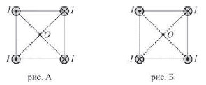 ?) в точке 1 модуль вектора магнитной индукции больше, чем в точке 2 ?) модули векторов магнитной индукции в точках 1 и 2 одинаковы ?) данных условия задачи не достаточно для сравнения модулей векторов магнитной индукции в точках 1 и 2 ?) в точке 2 модуль вектора магнитной индукции больше, чем в точке 1 Вопрос id:437262 Тема/шкала: B14-Электричество и магнетизм-Направление магнитного поля Четыре прямолинейных параллельных друг другу тонких проводника с одинаковым током I проходят через вершины квадрата. Сначала их располагают так, как показано на рис. А, а затем - так, как показано на рис. Б (на рисунках показан вид со стороны плоскости квадрата).