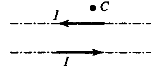 По двум тонким прямым проводникам, параллельным друг другу, текут одинаковые токи I (см. рисунок). Как направлен вектор индукции создаваемого ими магнитного поля в точке С?