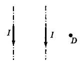 По двум тонким прямым проводникам, параллельным друг другу, текут одинаковые токи I (см. рисунок), направление которых указано стрелками. Как направлен вектор индукции создаваемого ими магнитного поля в точке D?