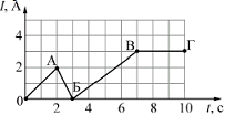 На рисунке показан график зависимости силы I электрического тока, текущего в катушке индуктивности, от времени t. В течение промежутков времени, соответствующим окрестностям точек А, Б и В, сила тока изменяется плавно. Модуль ЭДС индукции принимает минимальное значение в промежутке времени