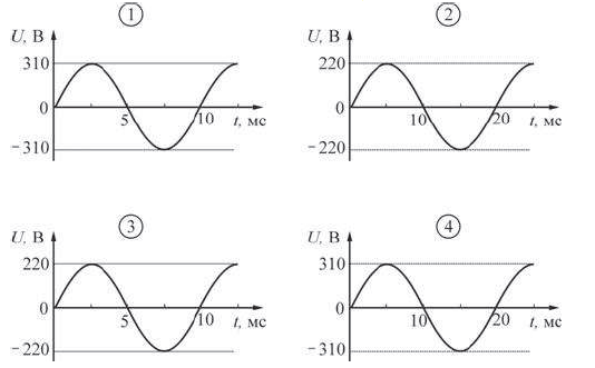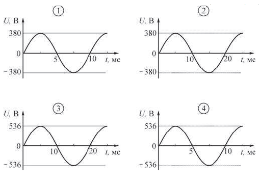?) 4 ?) 1 ?) 3 ?) 2 Вопрос id:437287 Тема/шкала: B14-Электричество и магнетизм-Переменный ток, трансформаторы Какой из приведенных ниже графиков зависимости напряжения