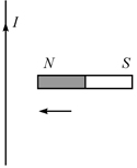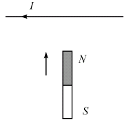 К прямолинейному вертикальному участку провода, по которому протекает постоянный ток I, медленно поднесли справа постоянный магнит, как показано на рисунке. Куда направлена магнитная сила, действующая на провод?