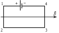 Электрическая цепь, состоящая из четырех прямолинейных горизонтальных проводников (1—2, 2—3, 3—4, 4—1) и источника постоянного тока, находится в однородном магнитном поле. Вектор магнитной индукции В направлен горизонтально вправо (см. рисунок, вид сверху). Куда направлена вызванная этим полем сила Ампера, действующая на проводник 1—2?