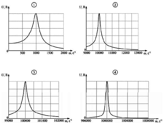 ?) 2 ?) 1 ?) 3 ?) 4 Вопрос id:437654 Тема/шкала: B16-Электромагнитная индукция. Оптика-Колебательный контур Колебательный контур состоит из последовательно соединенных резистора, конденсатора емкостью 10 мкФ и катушки индуктивностью 1 мГн. Какая из приведенных на рисунке резонансных кривых может принадлежать этому контуру?