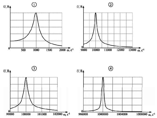 ?) 3 ?) 2 ?) 4 ?) 1 Вопрос id:437653 Тема/шкала: B16-Электромагнитная индукция. Оптика-Колебательный контур Колебательный контур состоит из последовательно соединенных резистора с малым активным сопротивлением, конденсатора емкостью 0,1 мкФ и катушки индуктивностью 1 мГн. Какая из приведенных на рисунке резонансных кривых может принадлежать этому контуру?