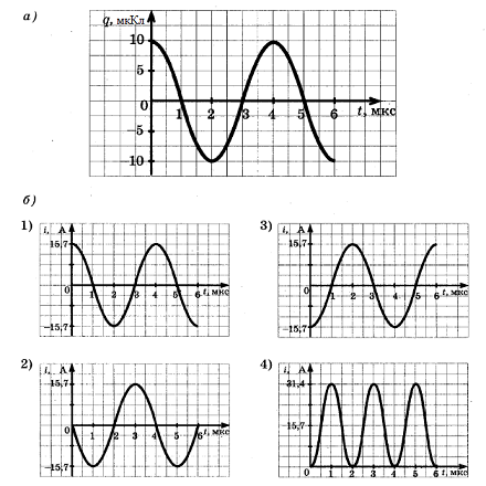 ?) энергия магнитного поля катушки увеличивается до максимального значения ?) энергия электрического поля конденсатора уменьшается от максимального значения до 0 ?) энергия магнитного поля катушки преобразуется в энергию электрического поля конденсатора ?) энергия электрического поля конденсатора преобразуется в энергию магнитного поля катушки Вопрос id:437652 Тема/шкала: B16-Электромагнитная индукция. Оптика-Колебательный контур На рисунке a приведен график зависимости изменения заряда конденсатора в колебательном контуре от времени. На каком из графиков — 1, 2, 3, или 4 (рис. б) — изменение силы тока показано правильно? Колебательный контур считать идеальным.