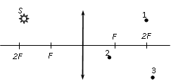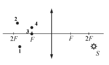 В какой из точек (1, 2, 3 или 4) находится изображение светящейся точки S (см. рисунок), создаваемое тонкой собирающей линзой с фокусным расстоянием F?