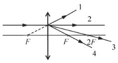 На собирающую линзу параллельно оптической оси падает луч света (см. рисунок). После прохождения через линзу луч пройдёт вдоль линии