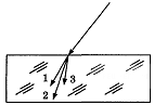 Для видимого света угол преломления световых лучей на некоторой границе раздела двух сред увеличивается с увеличением частоты излучения. Ход лучей для трех цветов при падении белого света из воздуха на границу раздела показан на рисунке. Цифрам соответствуют цвета