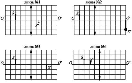 ?) в хрусталике ?) перед сетчаткой ?) на сетчатке ?) за сетчаткой Вопрос id:437712 Тема/шкала: B16-Электромагнитная индукция. Оптика-Линзы На рисунках представлены предмет S и его изображение S' , полученное с помощью четырёх различных собирающих тонких линз.