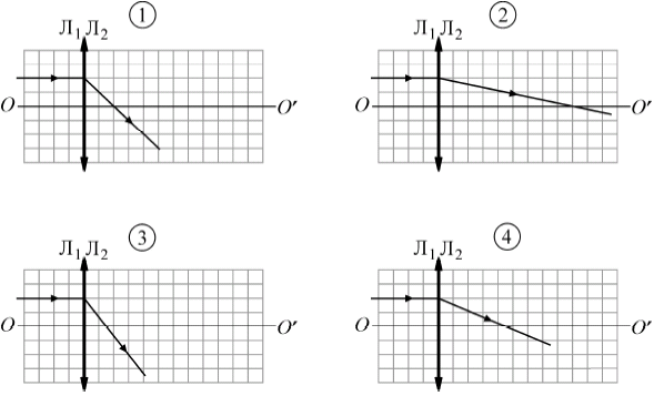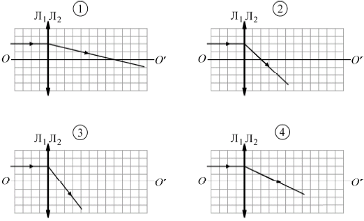 На рисунке изображены две тонкие собирающие линзы Л1 и Л2, имеющие общую главную оптическую ось OO', и показан ход через эти линзы лучей от точечного источника света S. На каком из следующих рисунков правильно показан ход светового луча, изначально направленного вдоль главной оптической оси и проходящего через две эти линзы, сложенные вместе вплотную друг к другу?