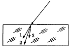 Для видимого света угол преломления световых лучей на некоторой границе раздела двух сред увеличивается с увеличением частоты излучения. Ход лучей для трех цветов при падении белого света из воздуха на границу раздела показан на рисунке. Цифрам соответствуют цвета