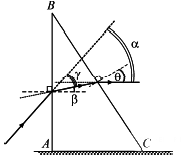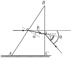 На грань АВ прямоугольной стеклянной призмы падает луч монохроматического света, который затем выходит из нее через грань BC. На рисунке показан ход луча в призме. Углами преломления луча при прохождении поверхностей AB и BC являются