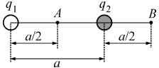 Два одинаковых маленьких шарика с электрическими зарядами q1 = 3 мкКл и q2 = −1 мкКл удерживаются на расстоянии a = 4 м друг от друга. Шарики соединяют на короткое время длинным тонким проводником. Как в результате этого изменятся следующие физические величины: электрический заряд первого шарика; модуль напряжённости электростатического поля, создаваемого обоими шариками в точке B.