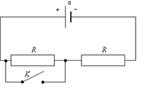 — ЭДС источника тока, R — сопротивление резистора. К — ключ. Внутренним сопротивлением источника тока и сопротивлением подводящих проводников можно пренебречь.