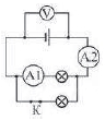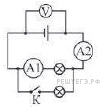 Электрическая цепь состоит из источника ЭДС с некоторым внутренним сопротивлением, двух одинаковых лампочек, ключа, вольтметра и двух амперметров (см. рисунок). Измерительные приборы можно считать идеальными. Как изменятся показания приборов, если замкнуть ключ? Для каждой величины определите соответствующий характер изменения: