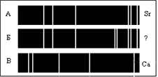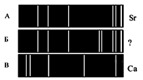 ?) только гелия ?) водорода и гелия ?) водорода, геля и еще какого-то вещества ?) только водорода Вопрос id:437886 Тема/шкала: B19-СТО. Физика атома, физика атомного ядра-Атомные спектры, энергетические уровни На рисунках А, Б, В приведены спектры излучения паров стронция, неизвестного образца и кальция.